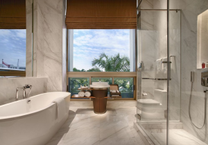 在寬大的衛(wèi)浴間里,干濕自然分離,良好的環(huán)境使得浴室柜有著充裕的容身之處。可以根據(jù)使用者的功能要求和審美需求來放置不同形式的浴室柜,各種洗浴用品、清潔用品以及衣物等分門別類地置放。
